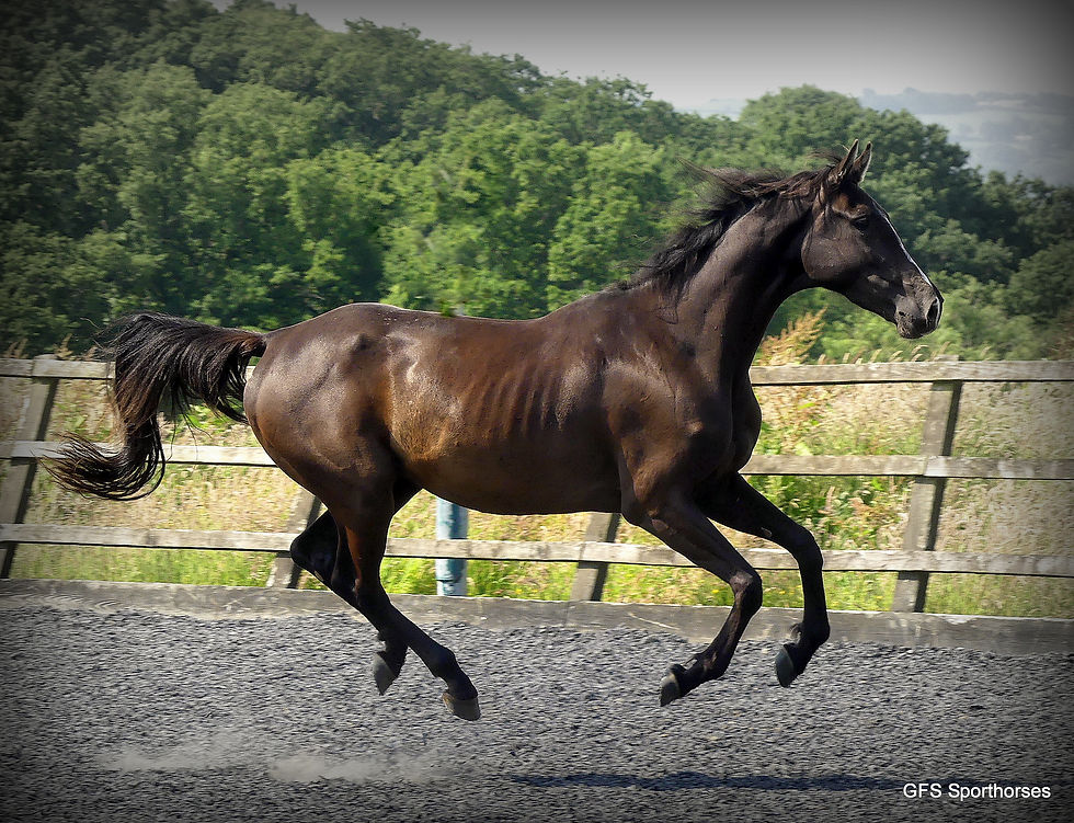 This fantastic mare is home bred and out of my all time heart horse Wantasia (Indoctro x Corland/Nimmerdor) She is by yet our very special AES Graded home bred GFS Lord of the Dance who was by a remarkable Russian Trakehner x Akhal Teke stallion that I imported as a yearling from Estonia and out of a very special mare who produced three Licenced stallions for me. With further details of their breeding on this website, I will give a brief explanation of this young mares superb maternal pedigree;
